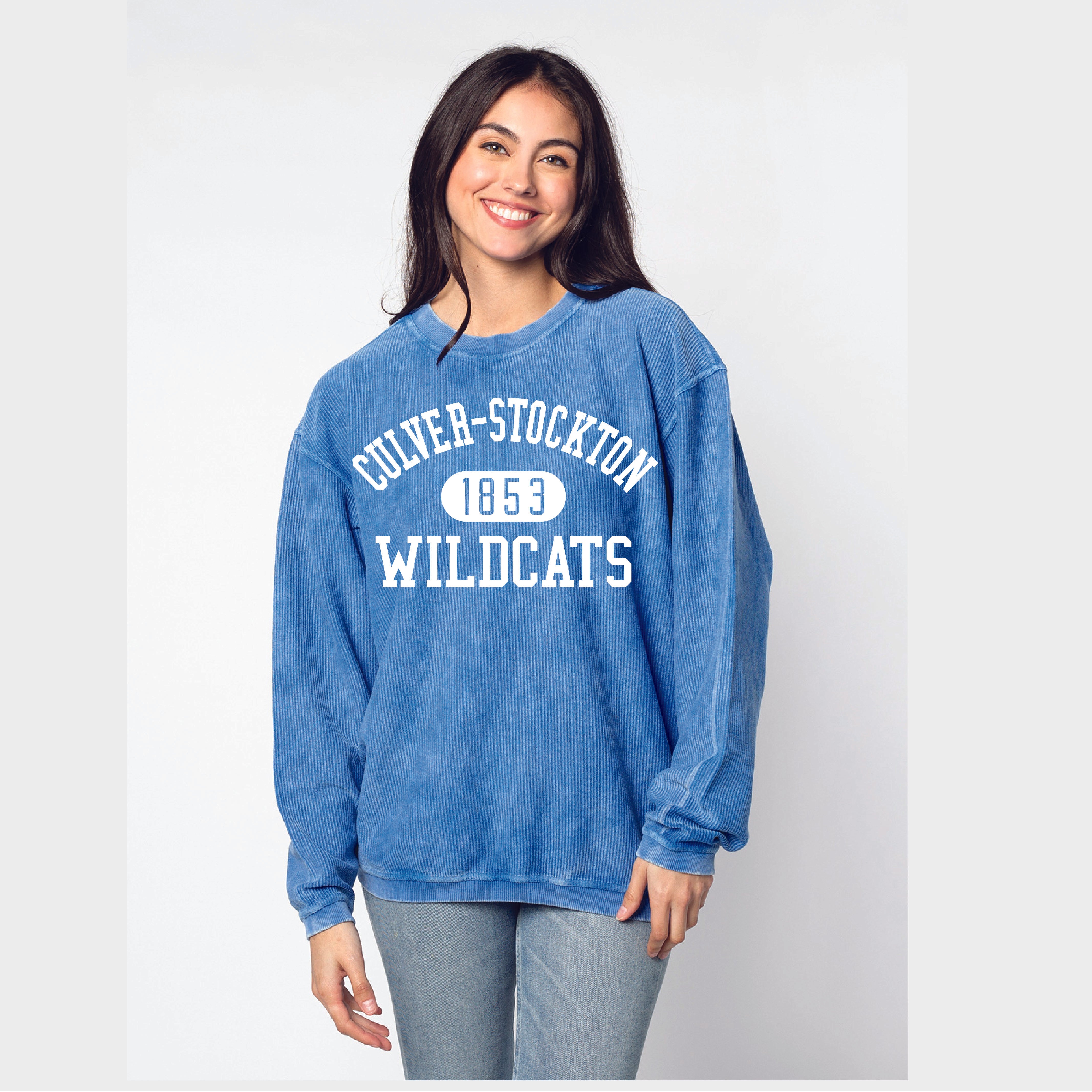 Enjoy this classic Culver-Stockton Wildcats design on soft, vintage wash corded crew in Royal Blue!