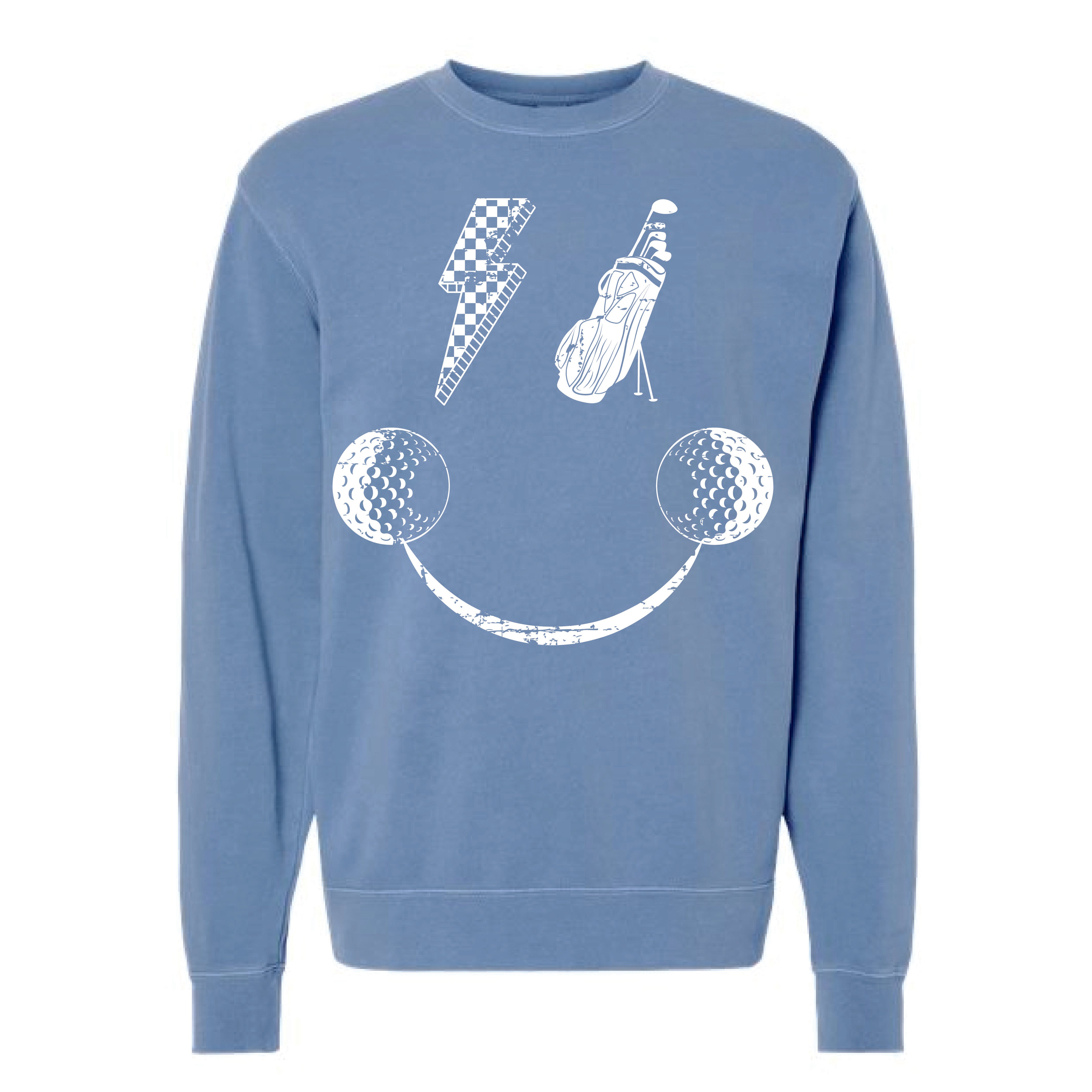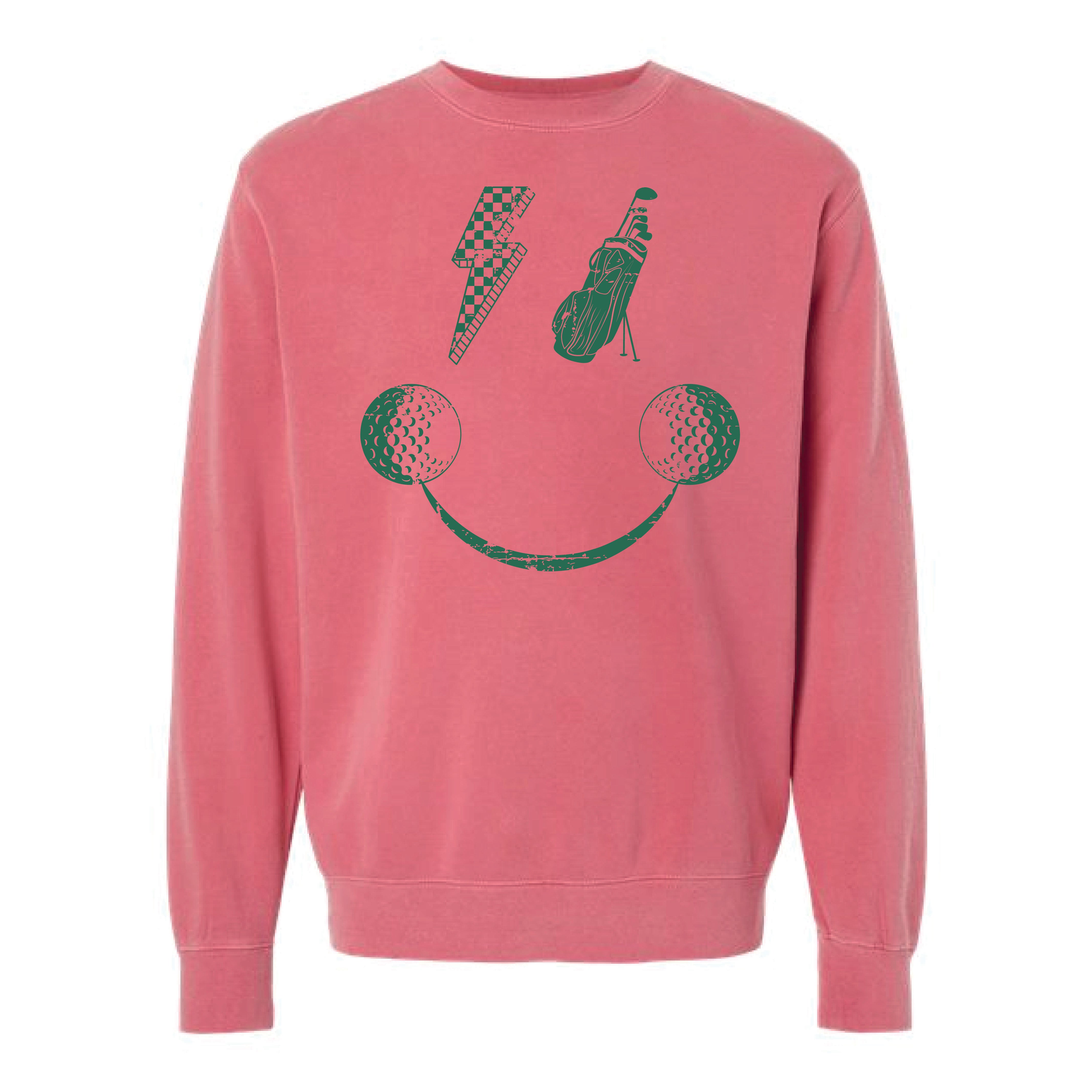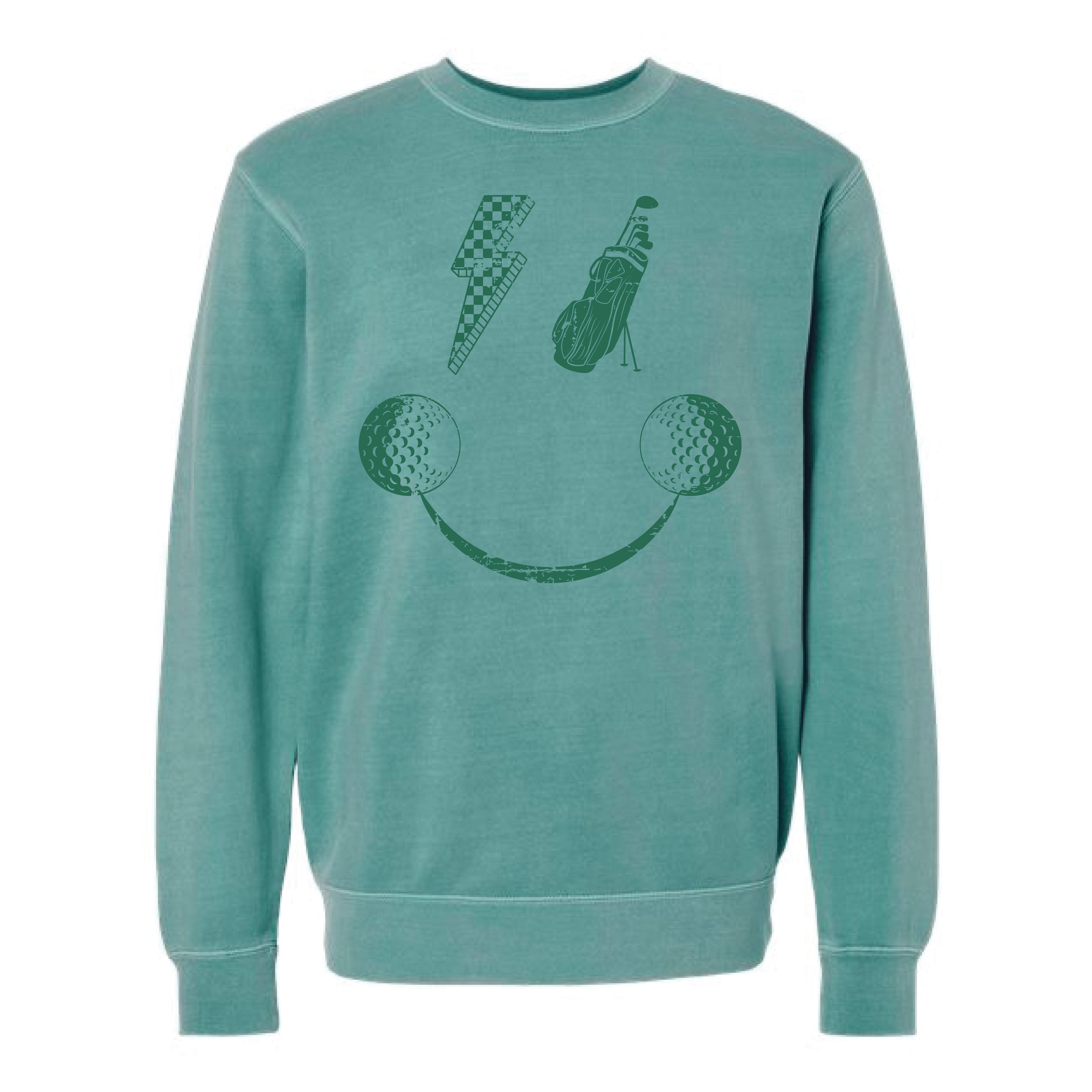 Enjoy our Happy Golfer design featured on Independent Pigment dyed crewneck in Mint Green, Pink & Light Blue!