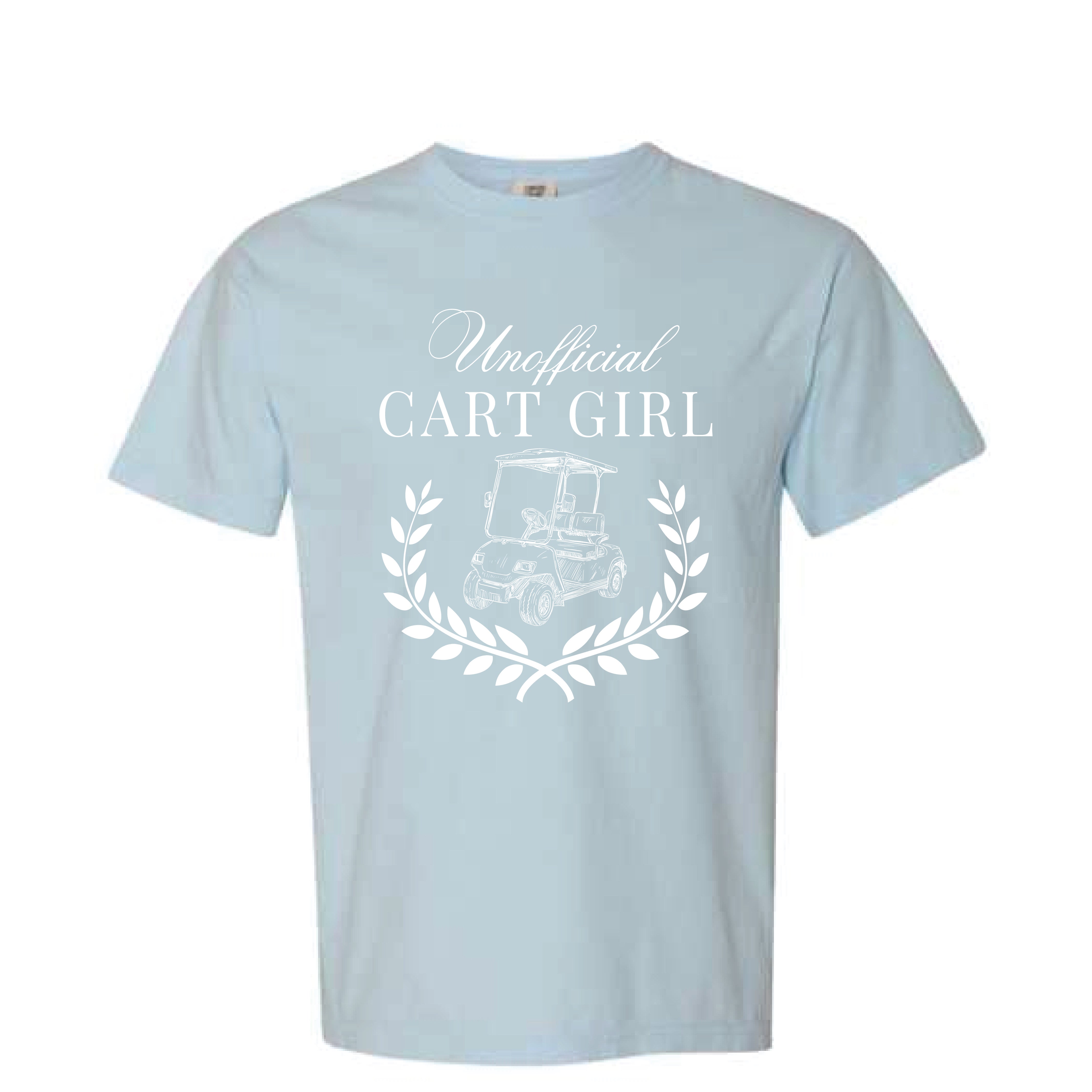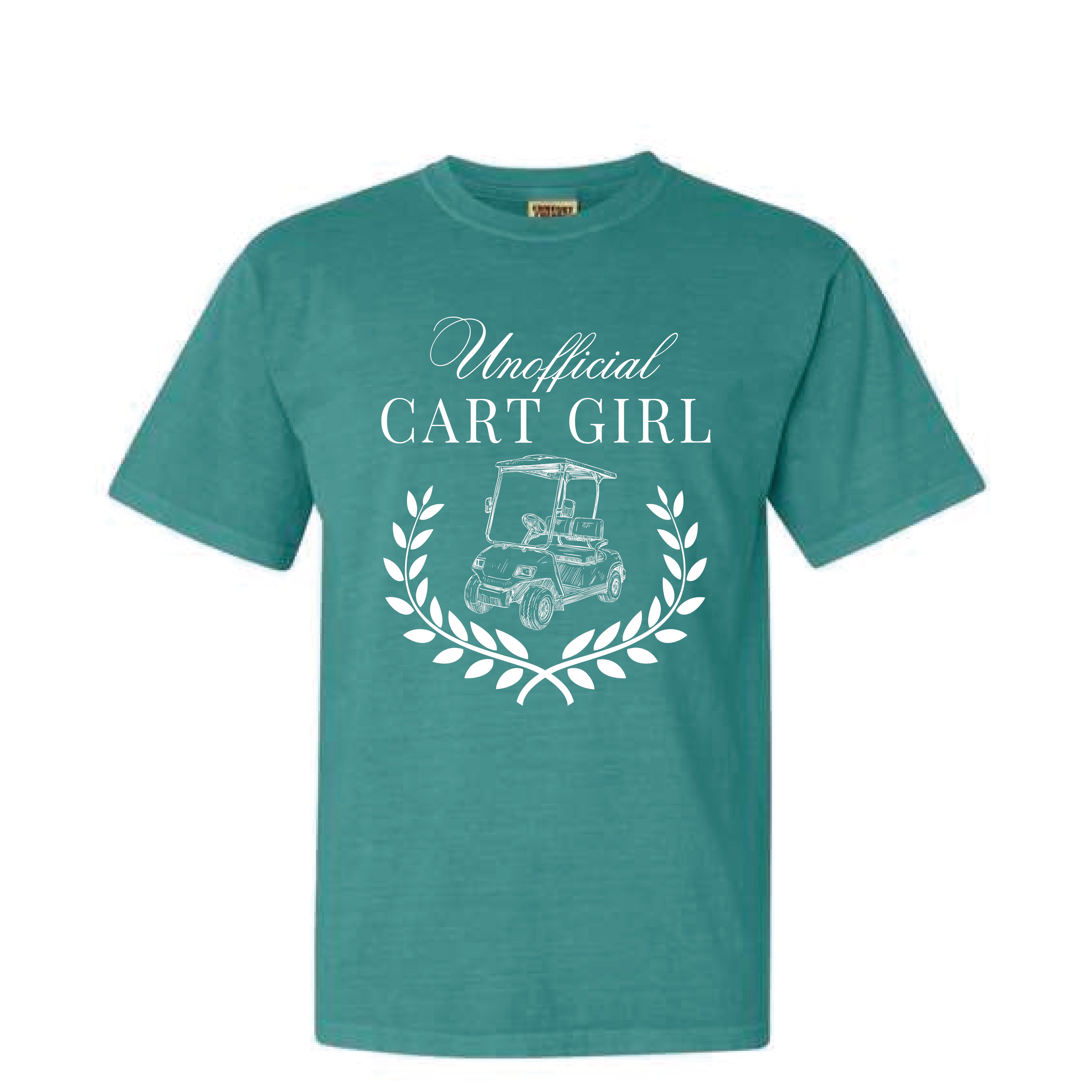 Our Unofficial Cart Girl design is featured on classic Comfort Colors t-shirt in seafoam & white!