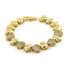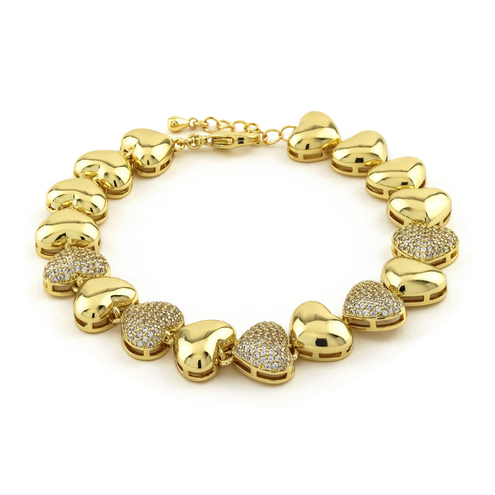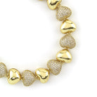 Add a touch of sparkle to your wrist with our Bubbles Heart Bracelet. This stunning gold bracelet is sure to catch anyone's eye with its delicate pave hearts. Perfect for adding a subtle touch of elegance to any outfit. Shine bright like a diamond (or pave heart in this case)!