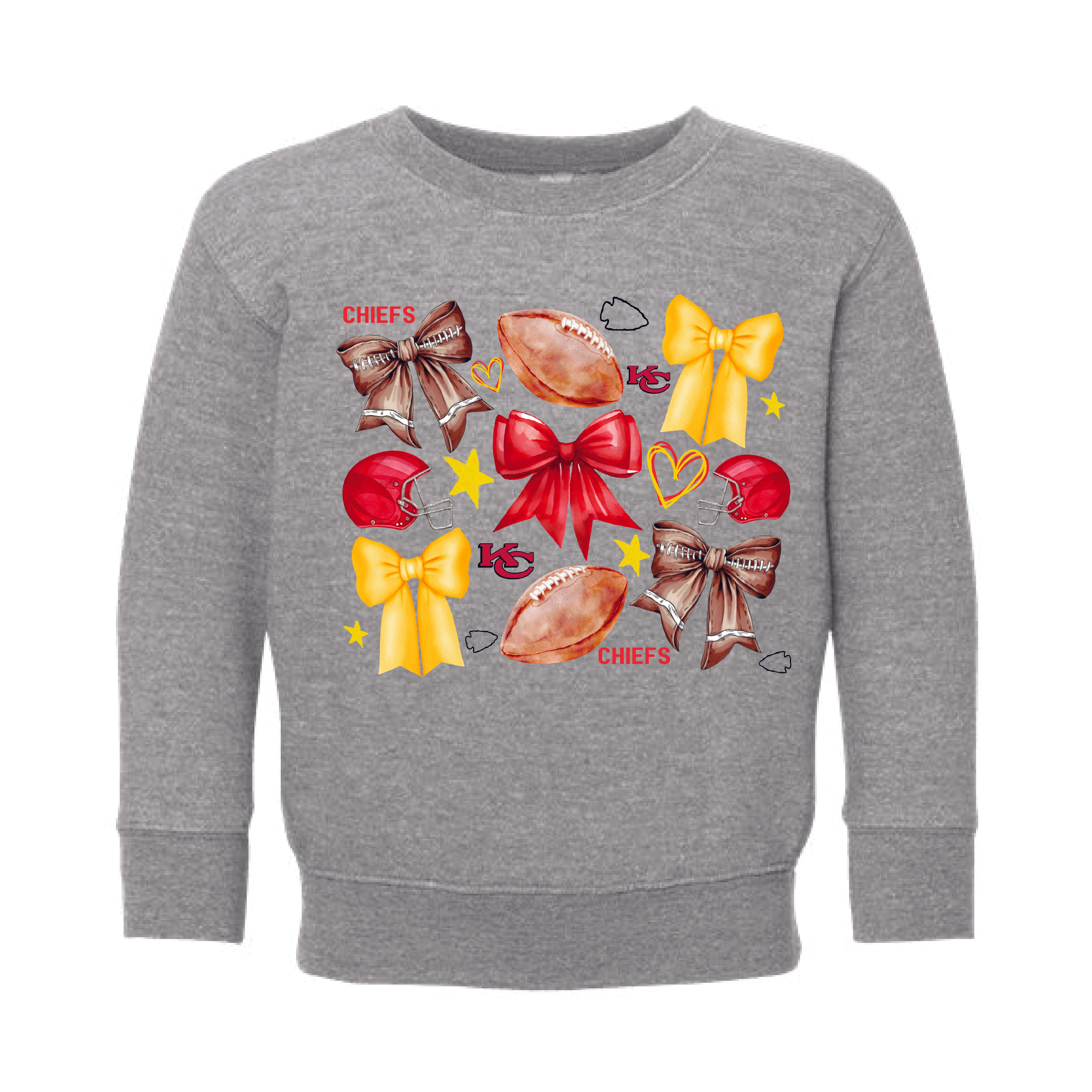 Enjoy our Retro KC Bows & Football design on toddler crew in Heather Grey!