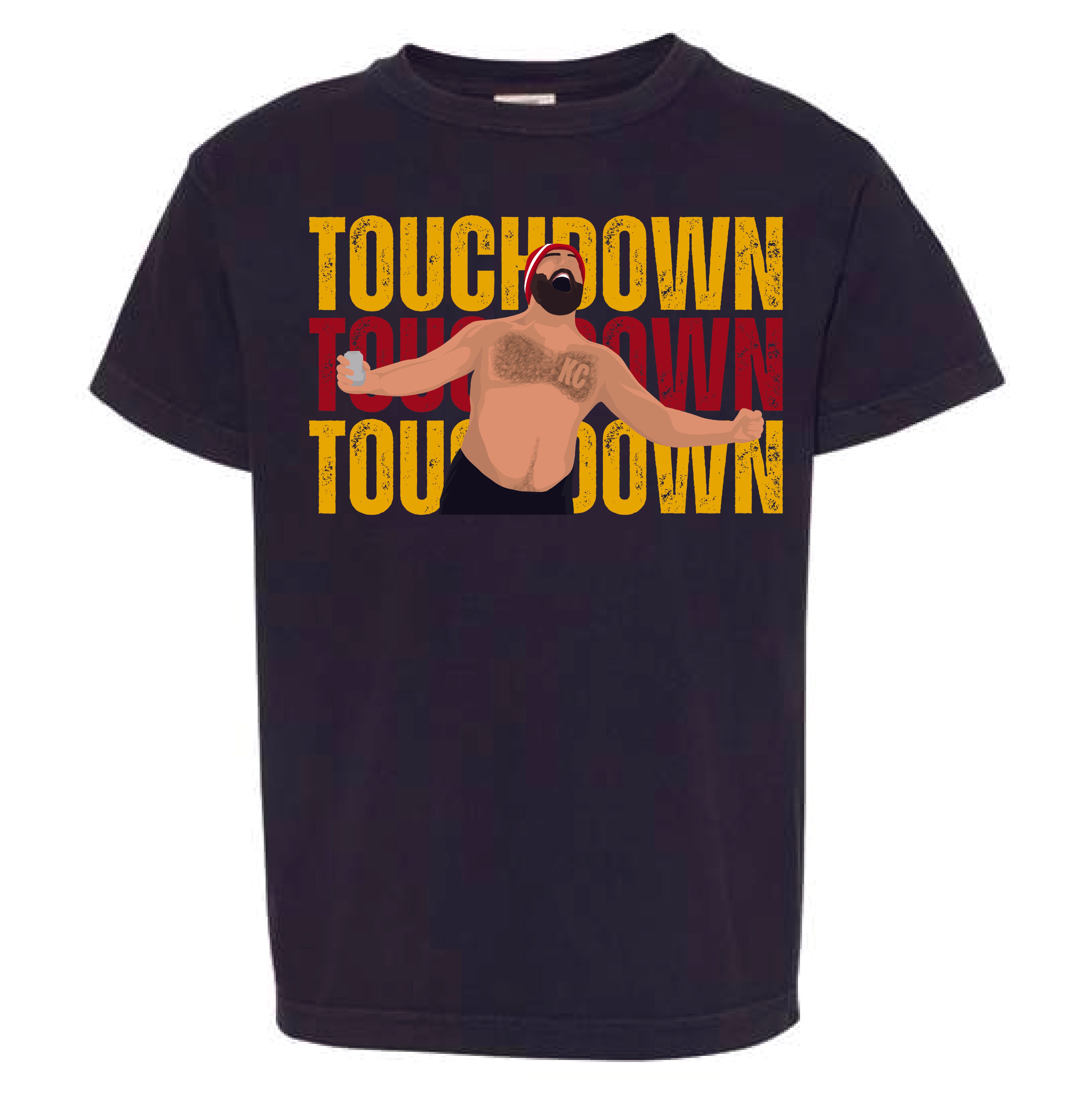 Kelce Touchdown featured on Comfort Colors youth tee in black!