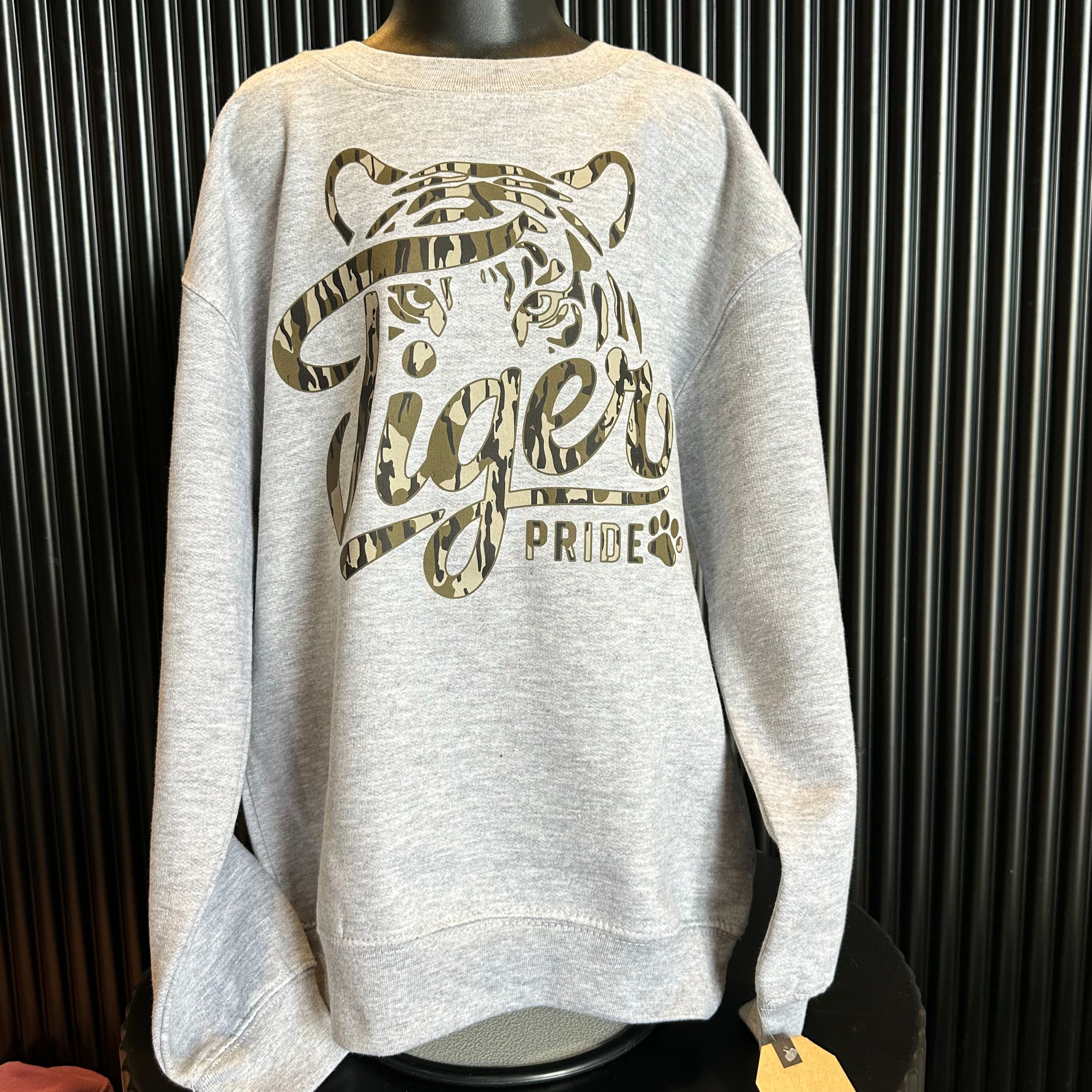 Enjoy our Tiger Pride camo design on quality heather grey crew!
