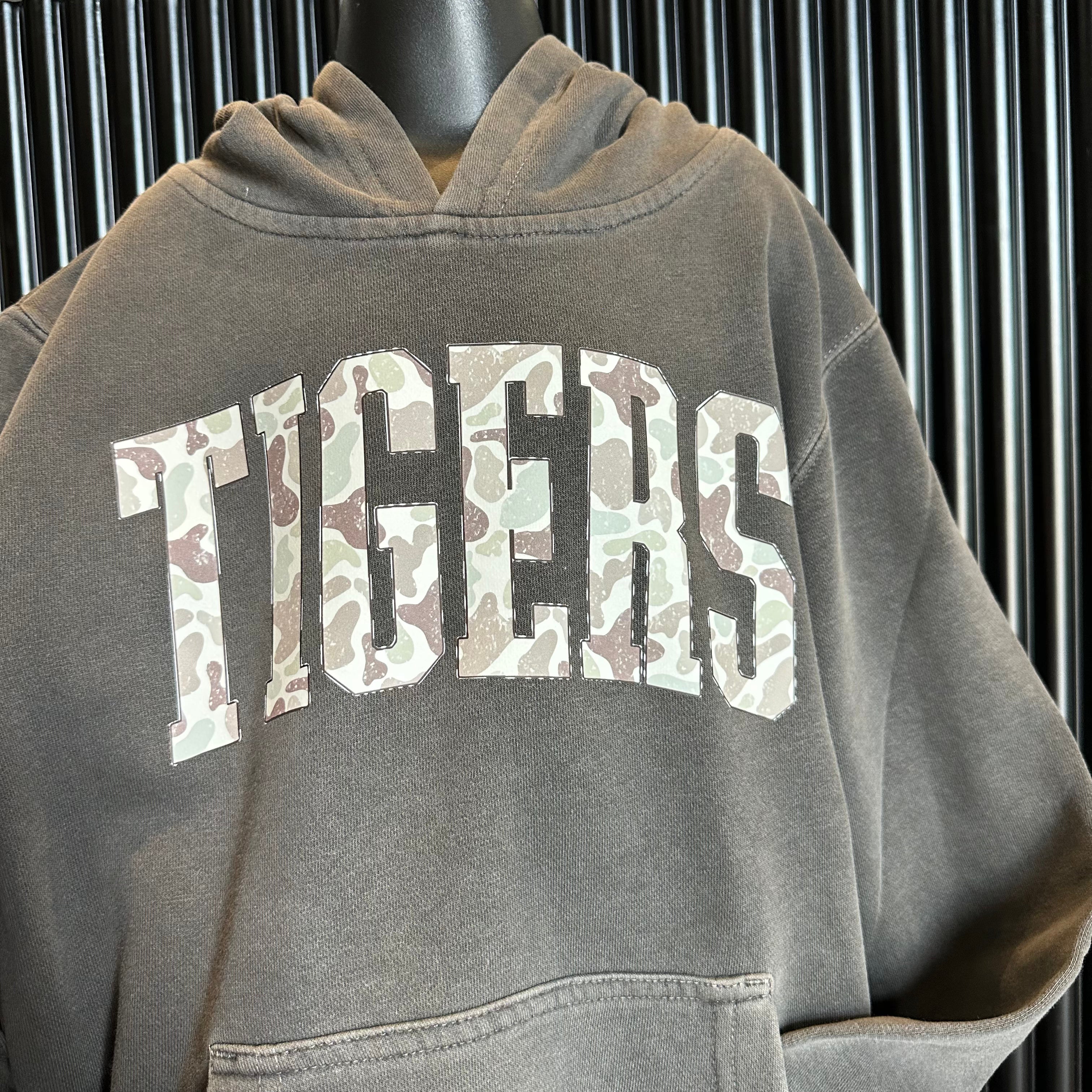 Enjoy our Camo Tigers design on pigment dyed hoodie.