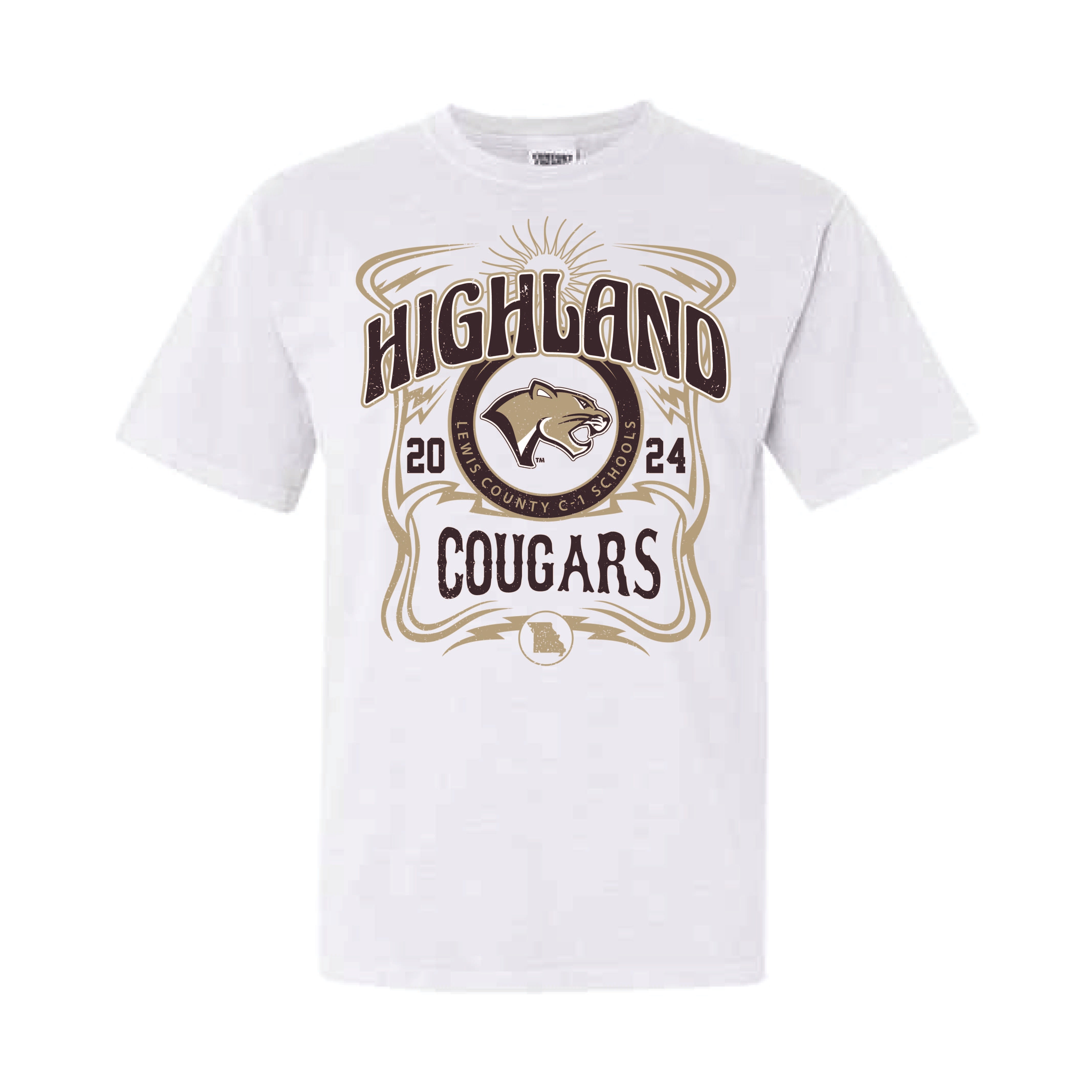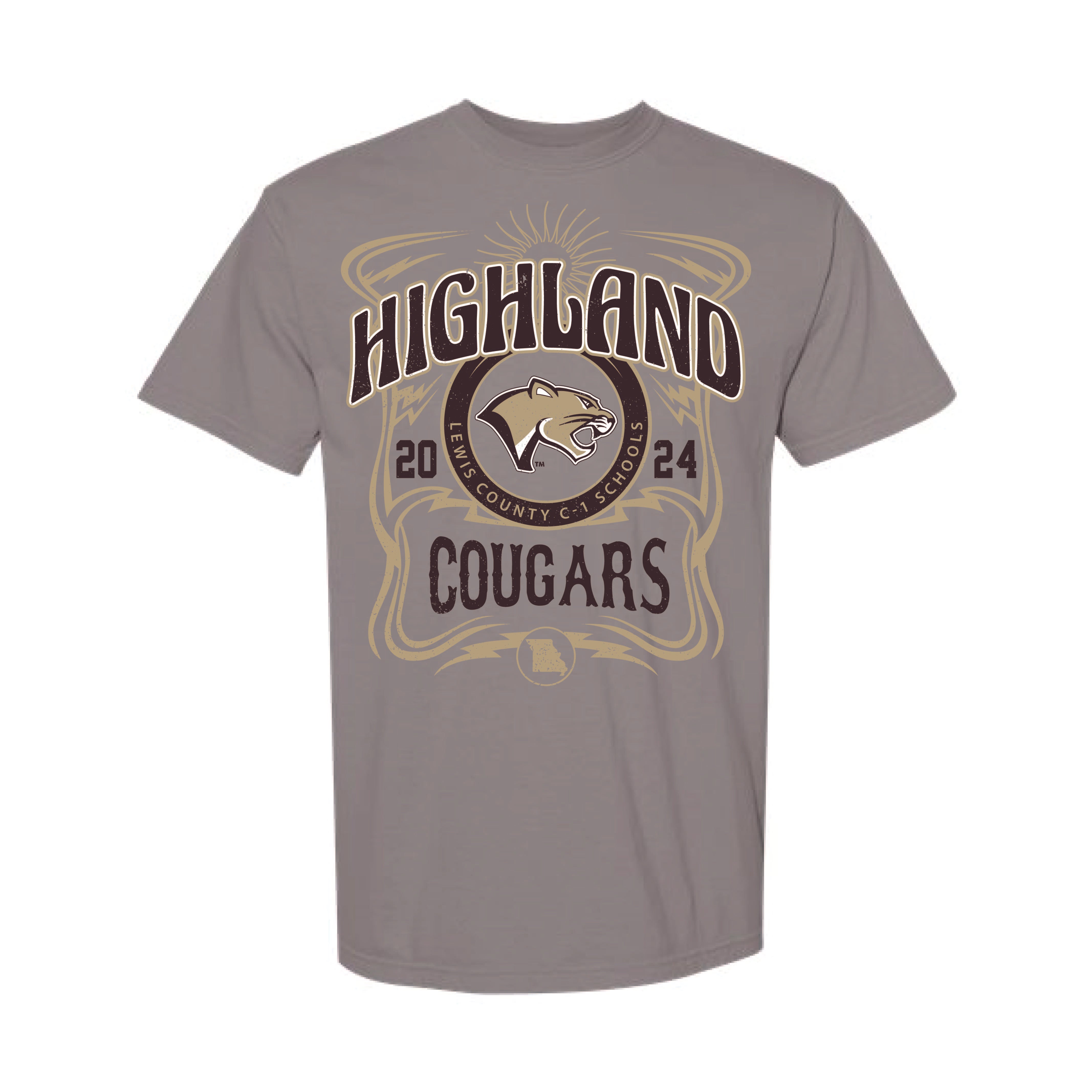 Enjoy our Highland Cougars graphic on Comfort Colors tee in Grey & White