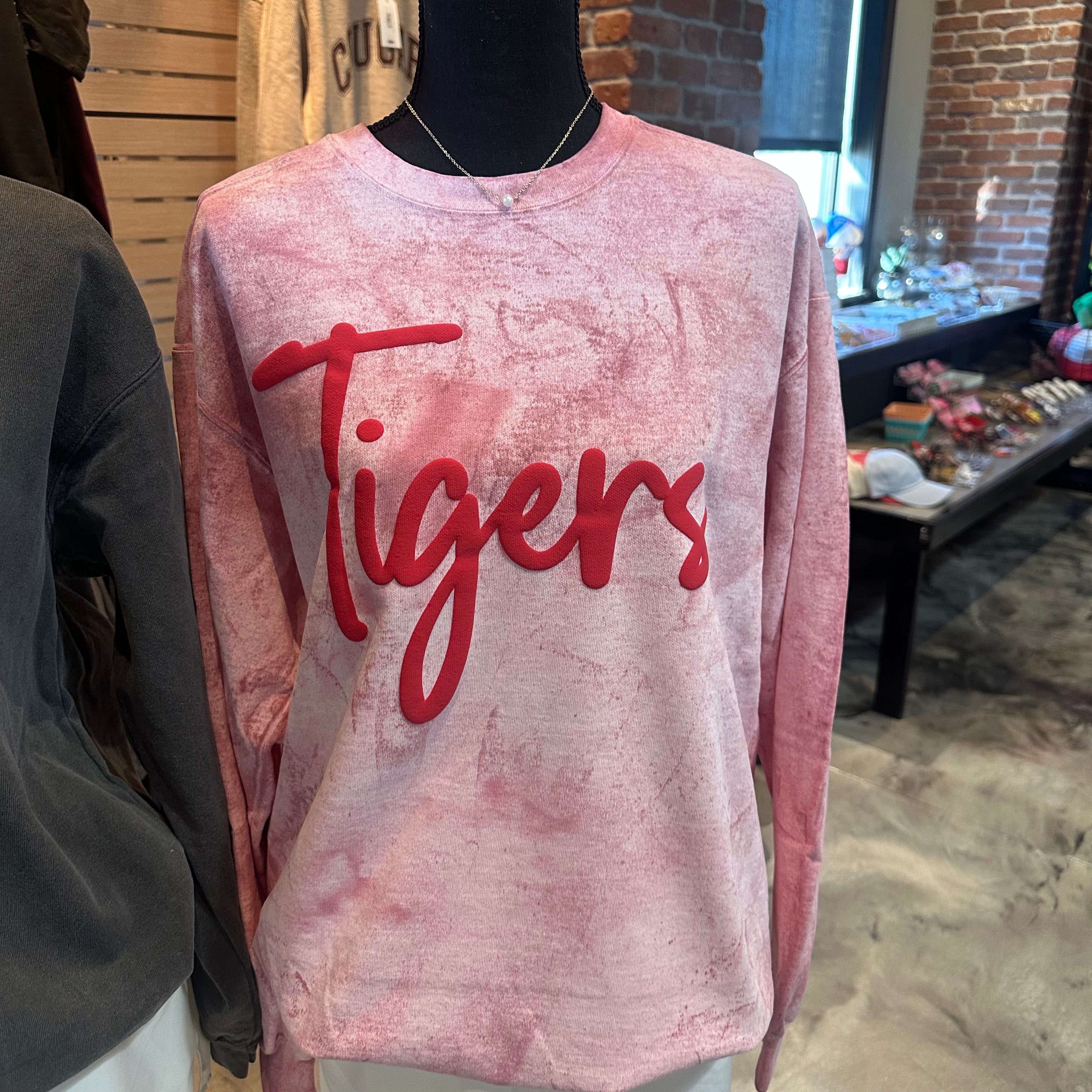 Enjoy our Tigers Puff design on Comfort Colors Color-Blast crew in Red!