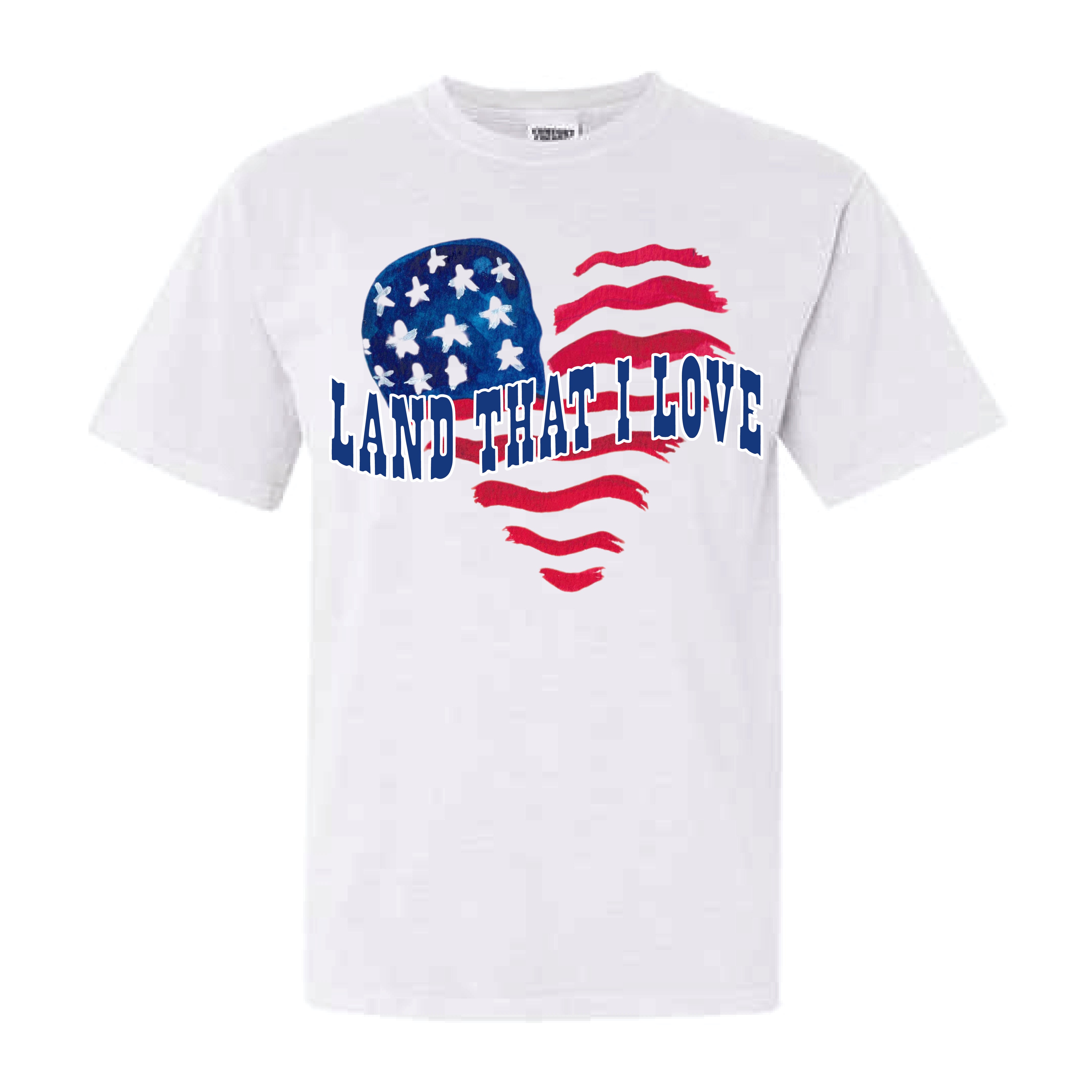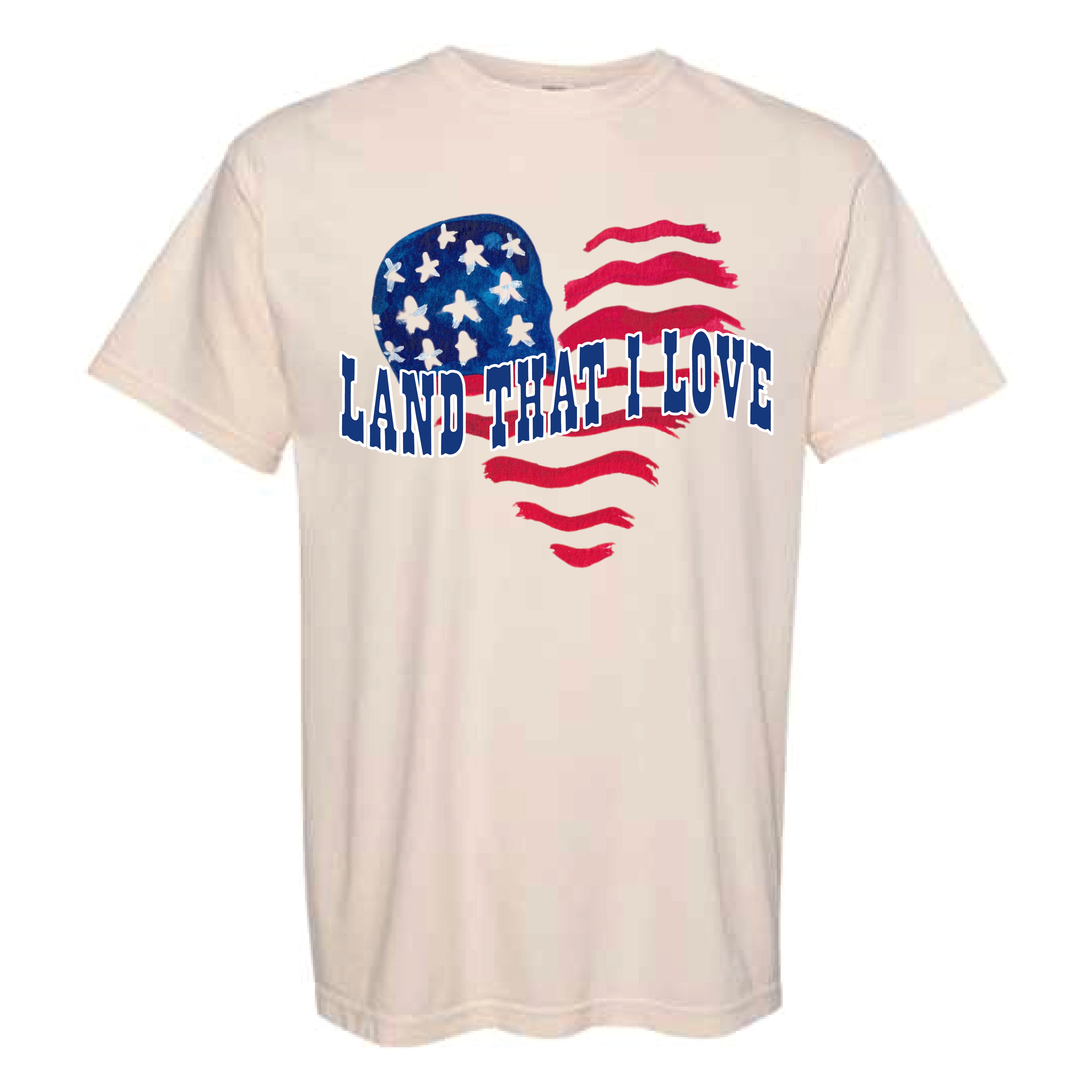 Our Land That I Love design is featured on Comfort Colors tee in Ivory & White