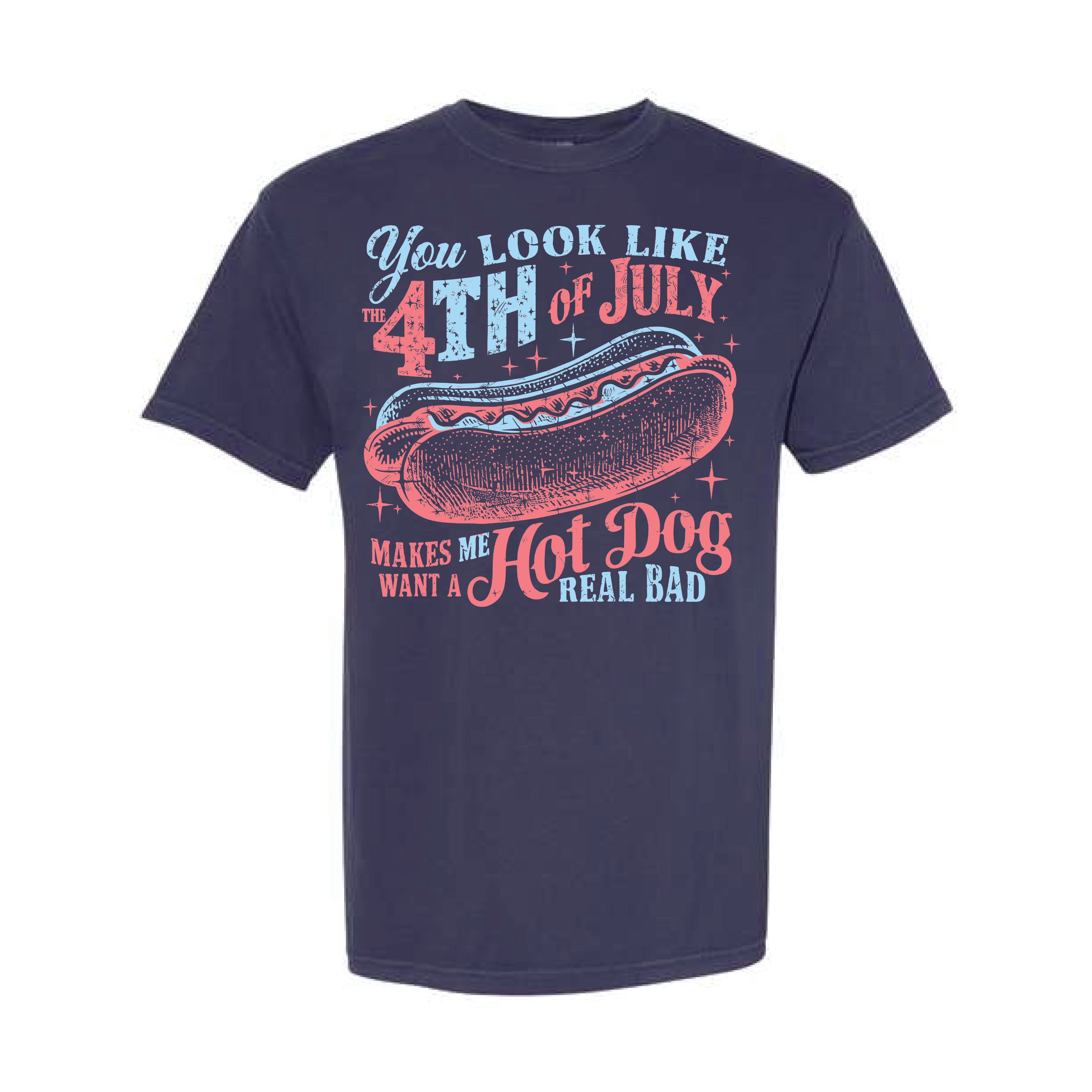 Enjoy our Makes Me Wanna Hot Dog design on Comfort Colors tee in Navy