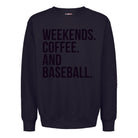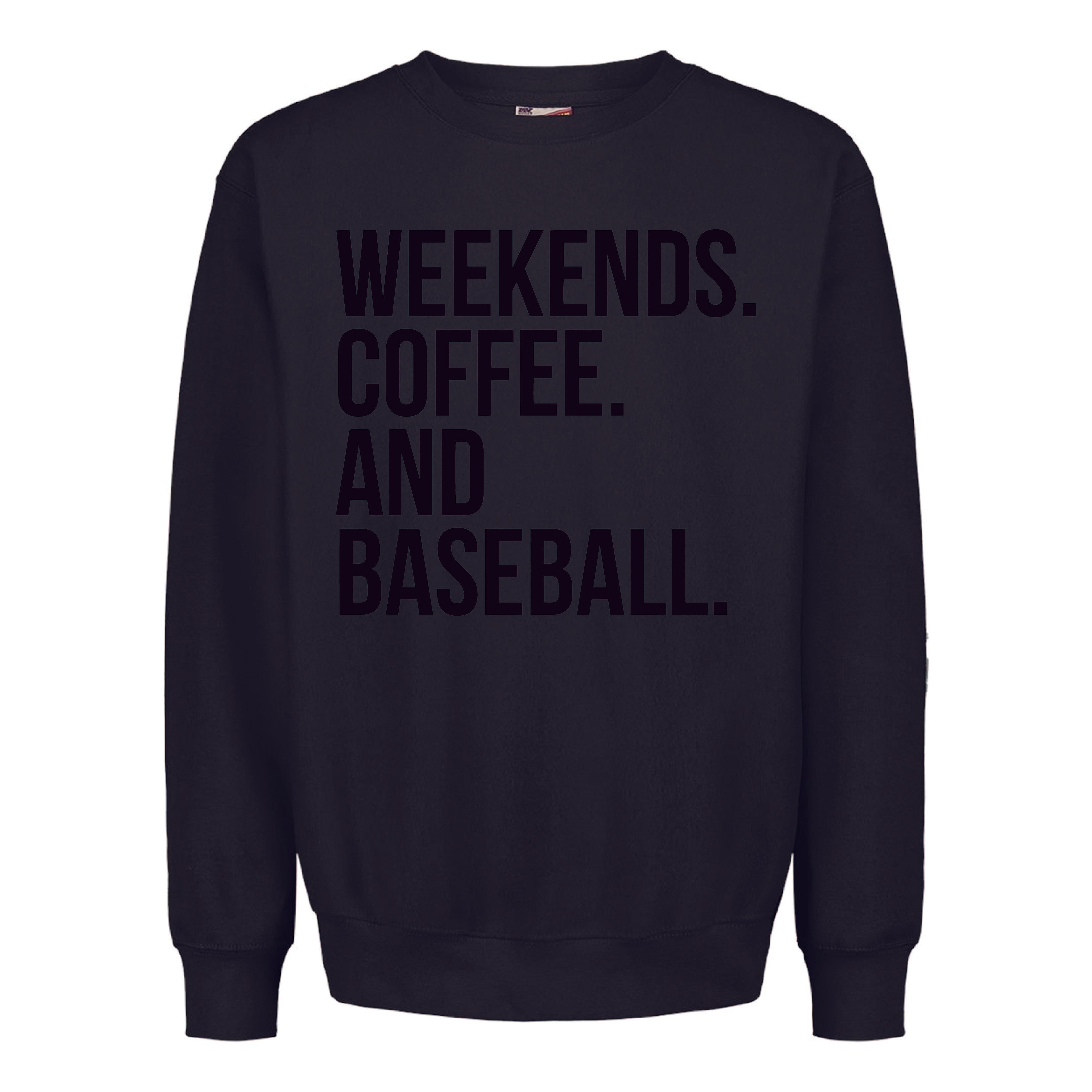 Our Weekends. Coffee, & Baseball design is printed with puff letters and featured on MV Sport Crewneck with a monochromatic, black on black style!