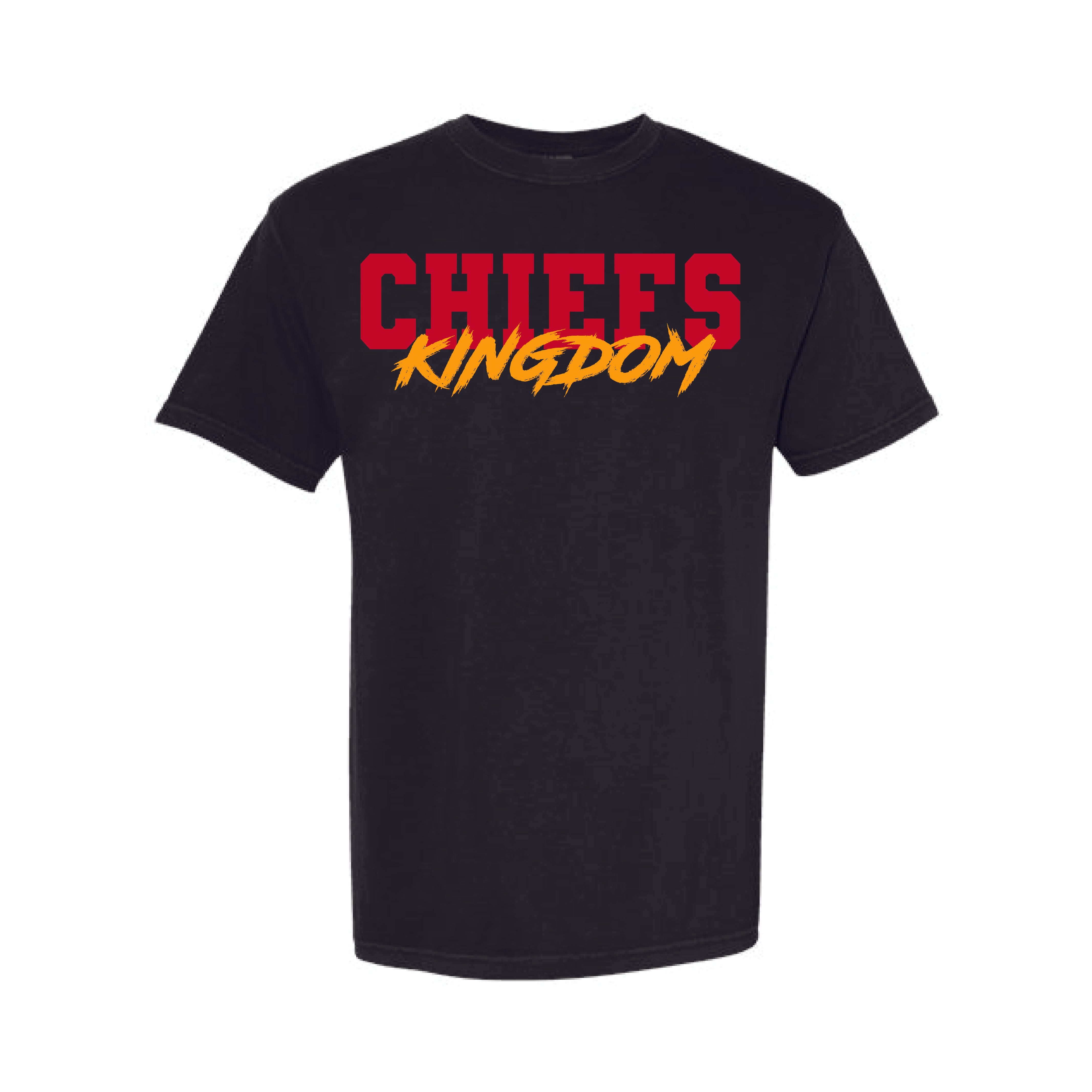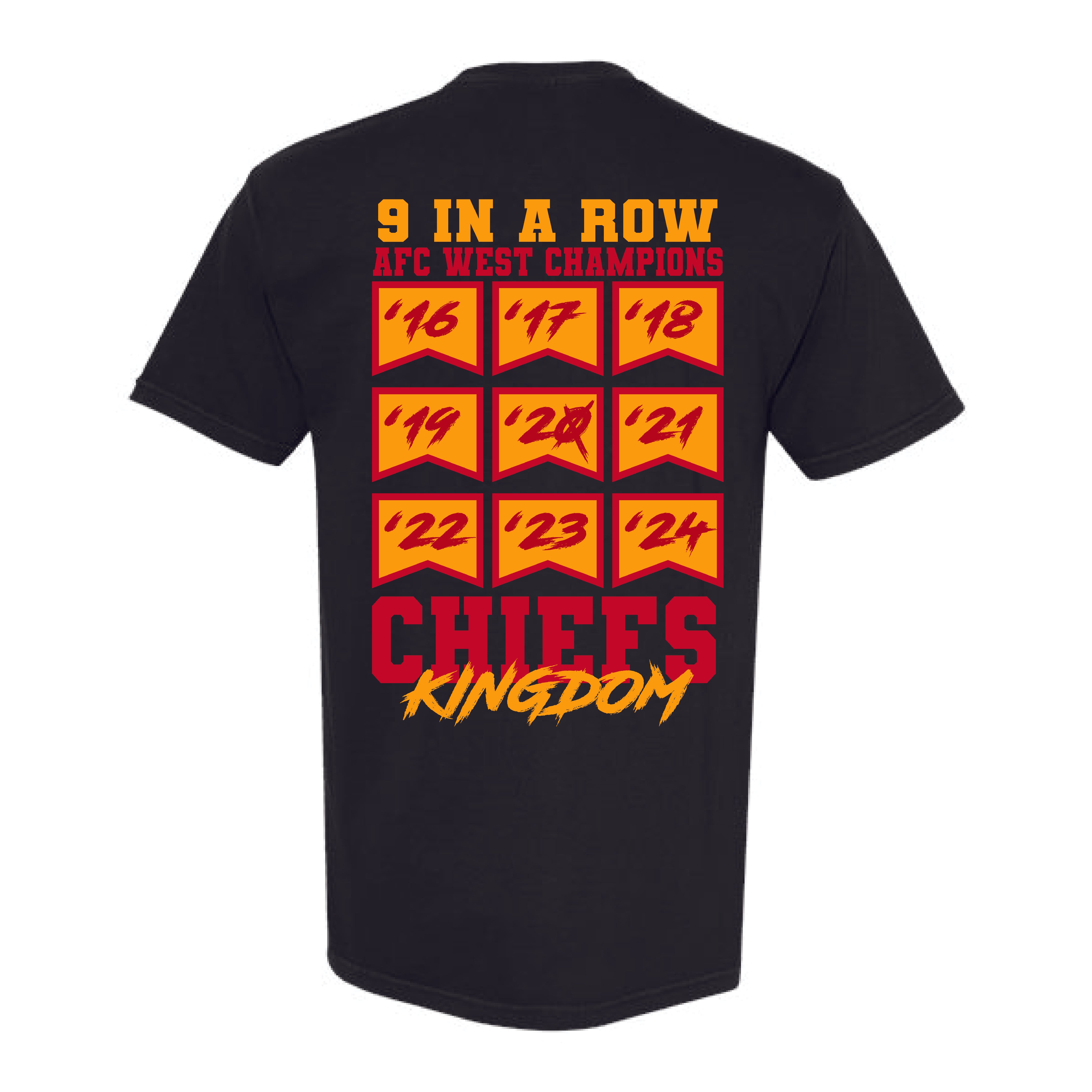 Enjoy our Chiefs Kingdom - 9 In a Row design on Comfort Colors Graphic tee in black.
