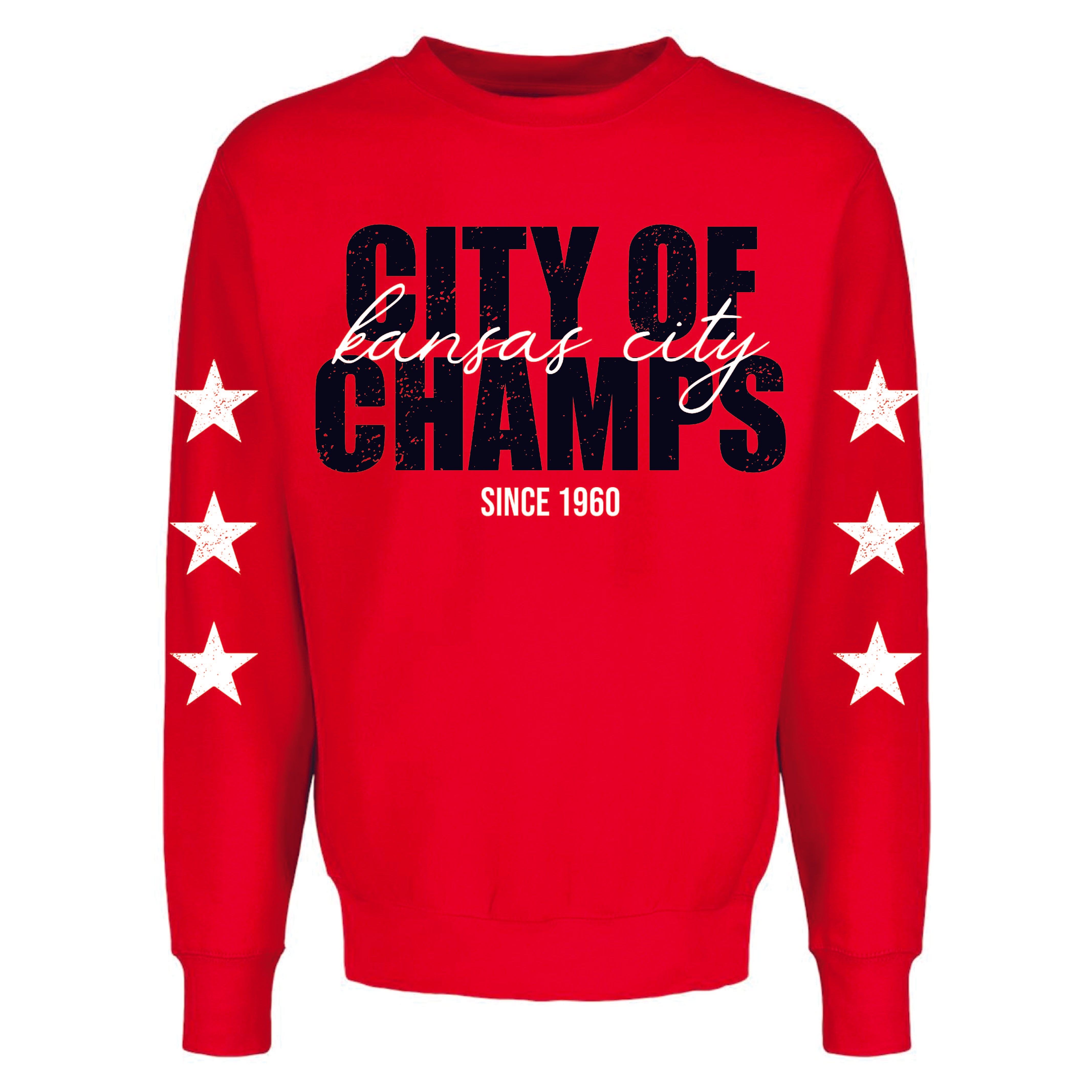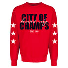 Our City of Champs design is featured on the MV Sport oversized crewneck sweatshirt in red.
