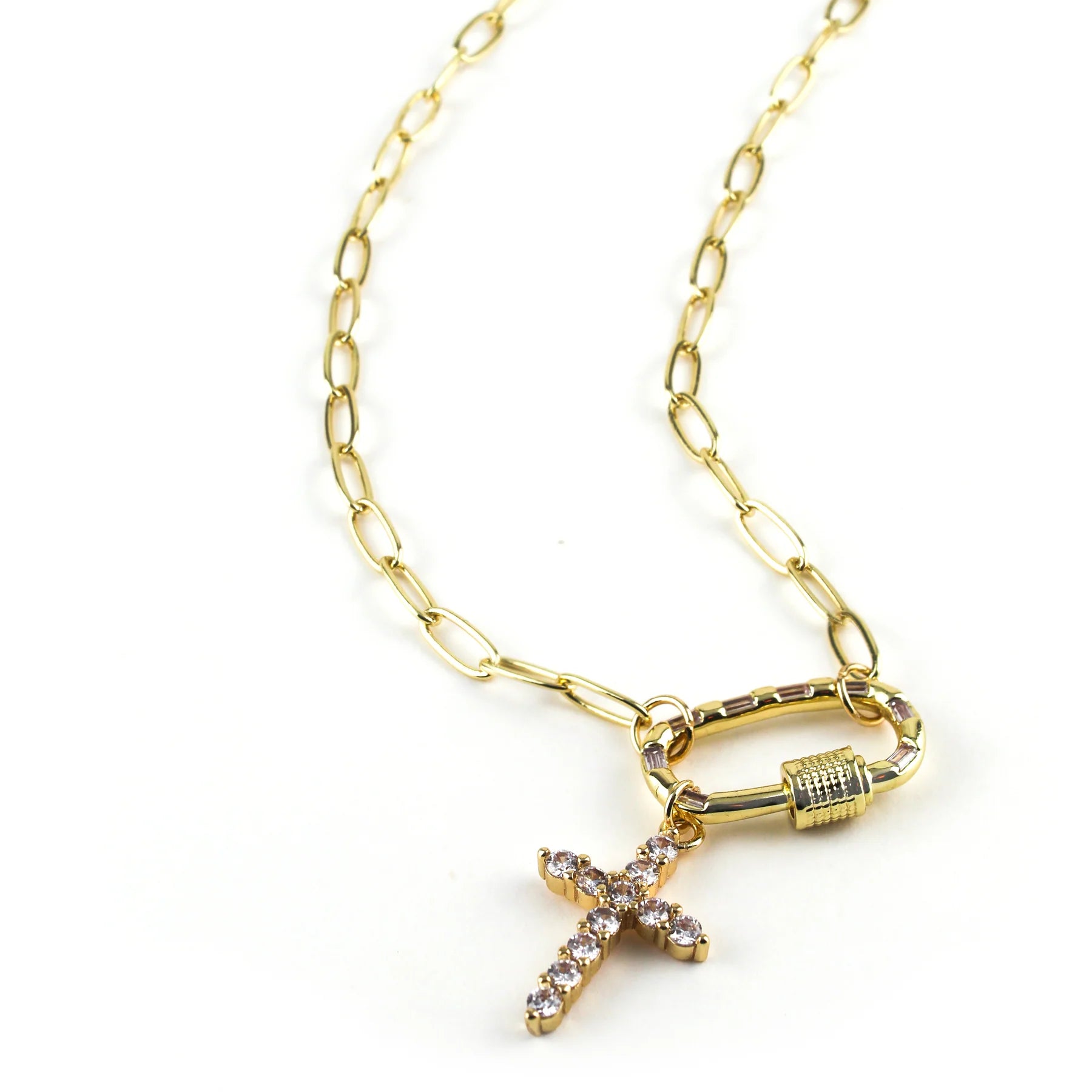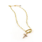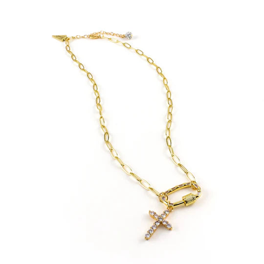 Add a touch of sparkle to your look with the Mary Necklace. Featuring a gold lock and chain with a crystal cross charm accent, this must-have accessory will add glamour to any outfit.