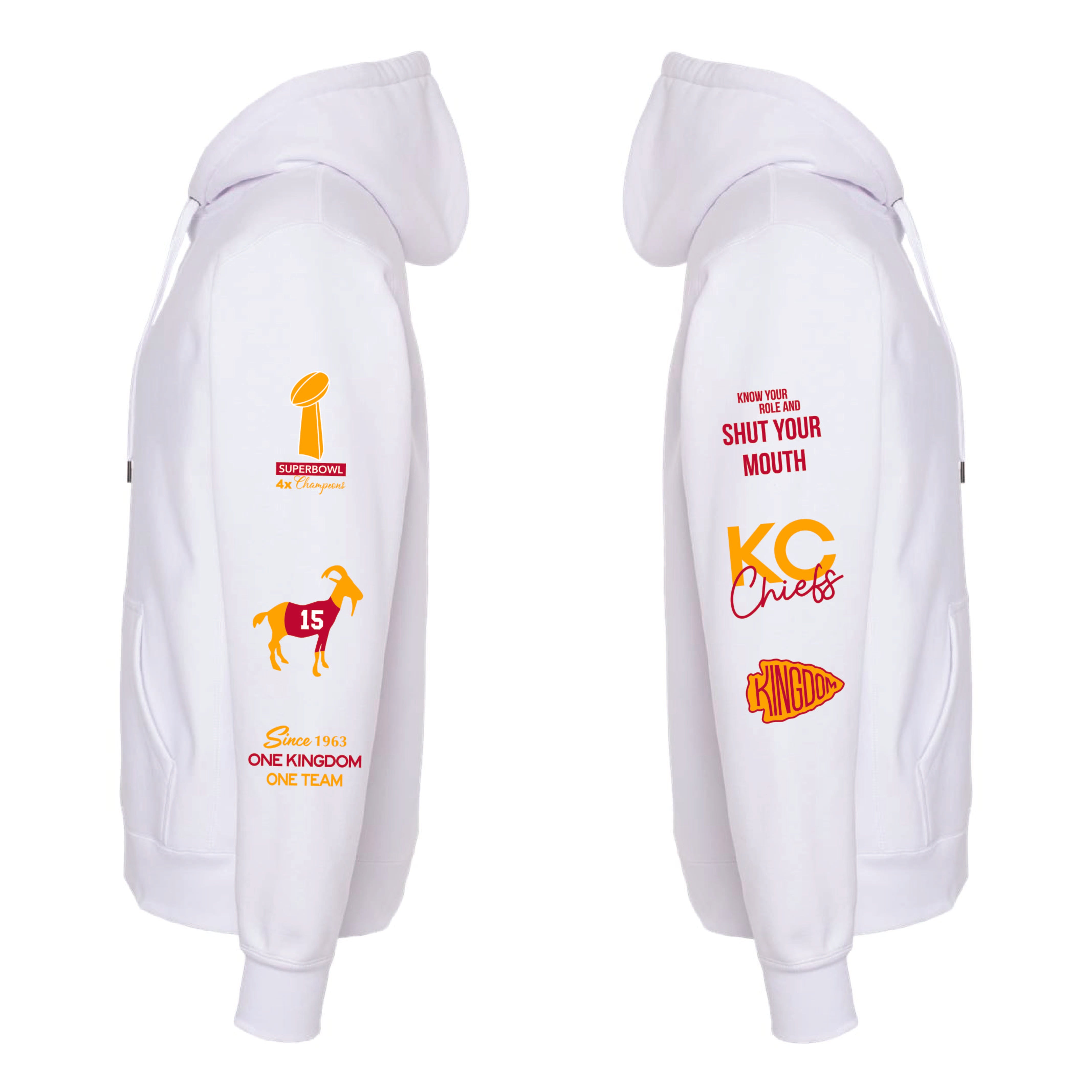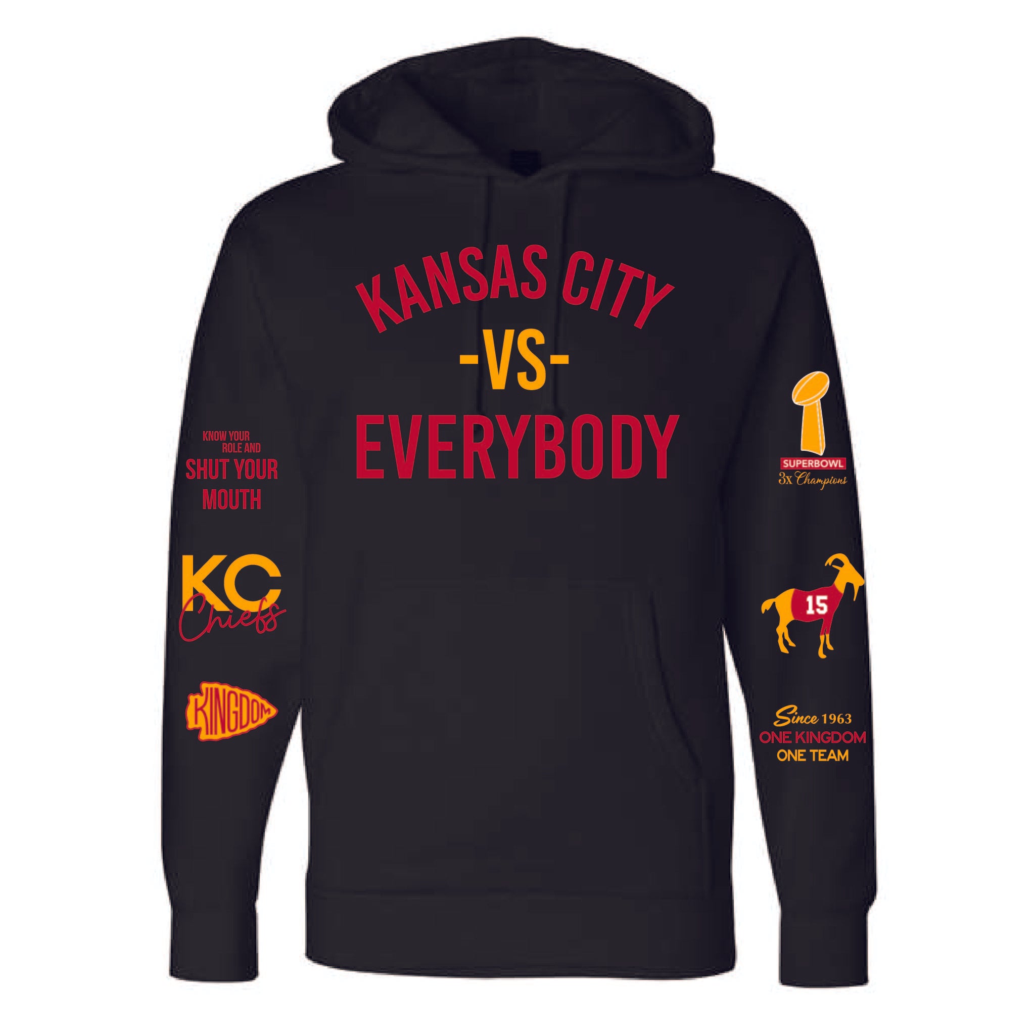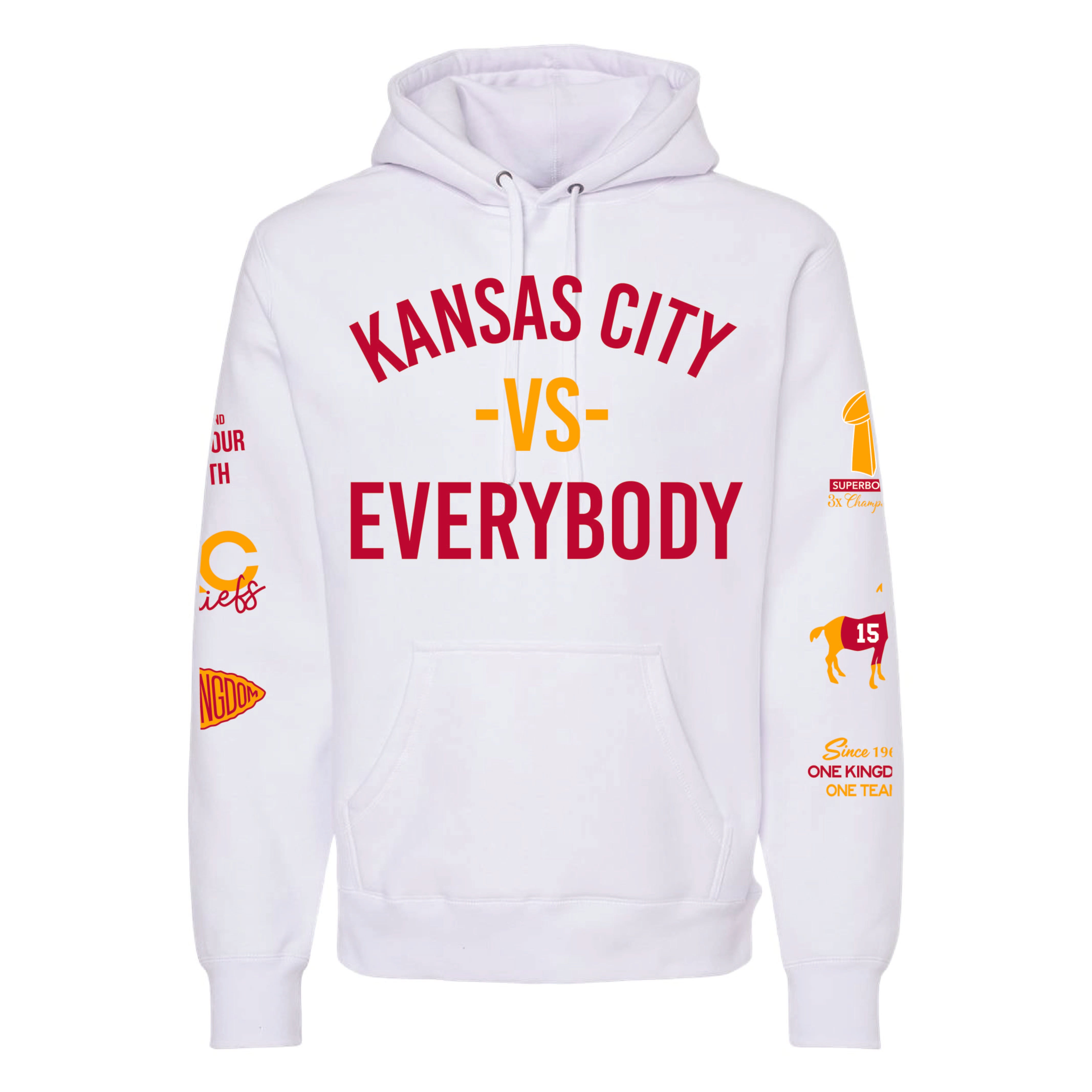 Our KC VS EVERYBODY design is featured on quality hoodie in white or black!