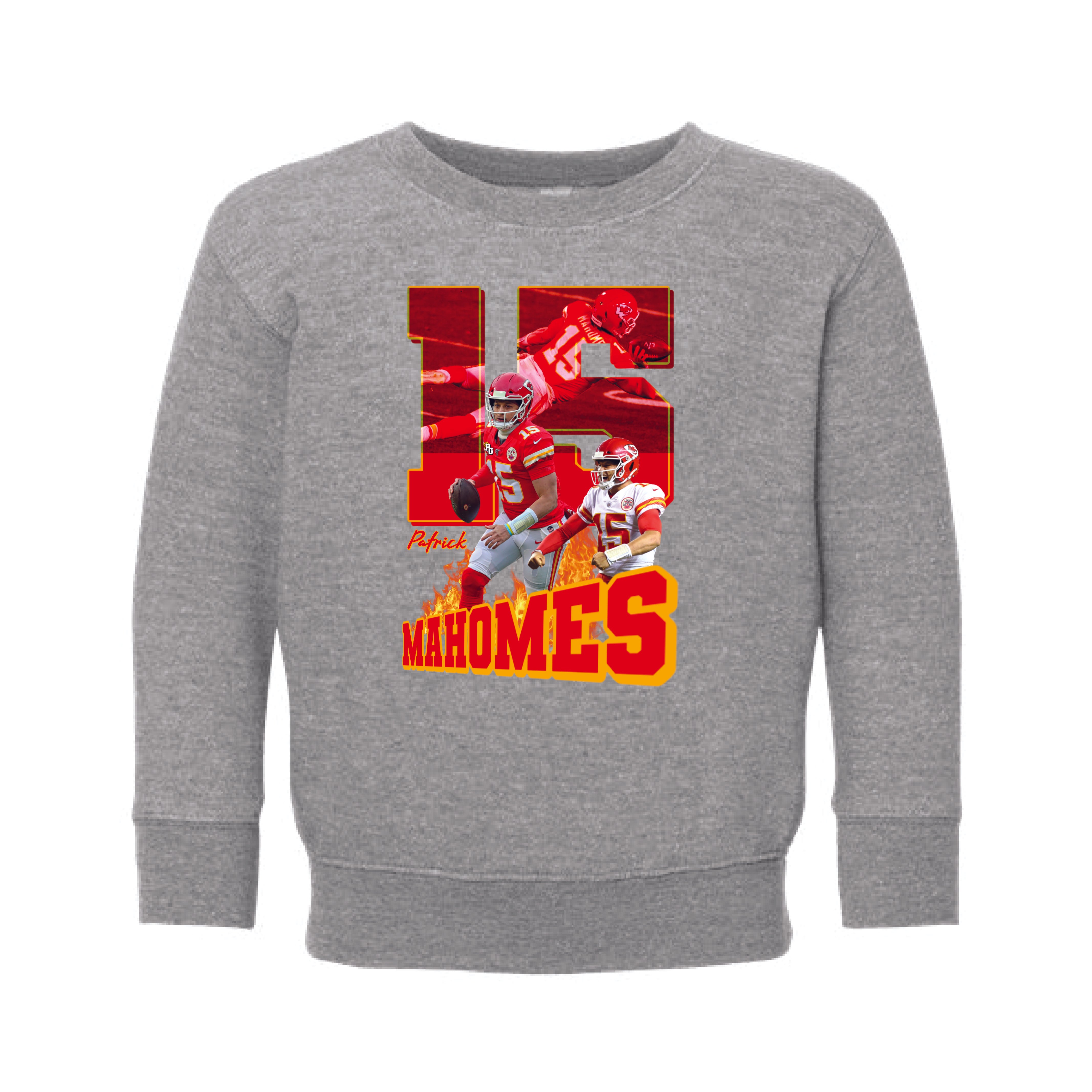 Enjoy our Retro Mahomes 15 design on toddler crew in Heather Grey!