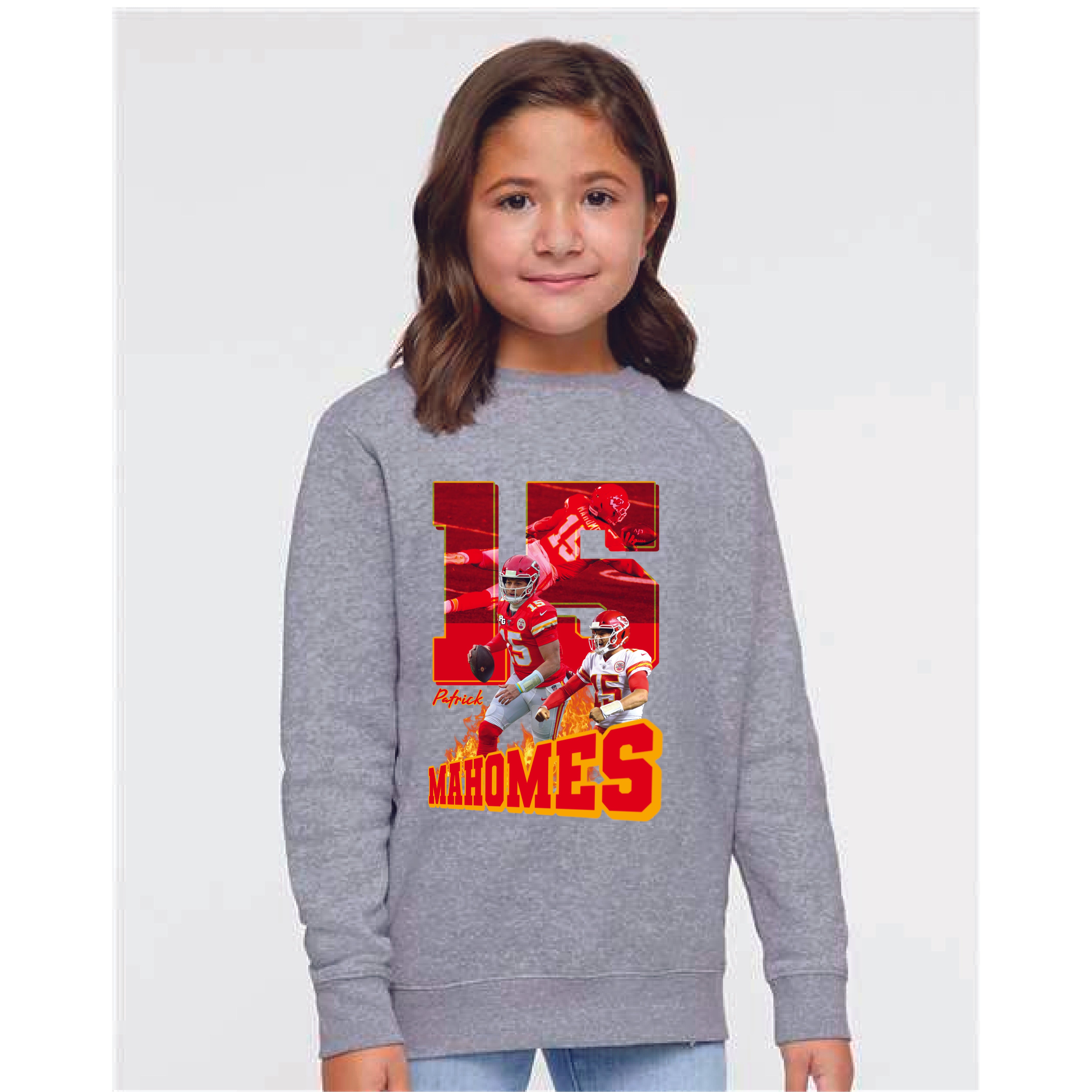 Enjoy our Mahomes 15 design on youth crewneck in heather grey!