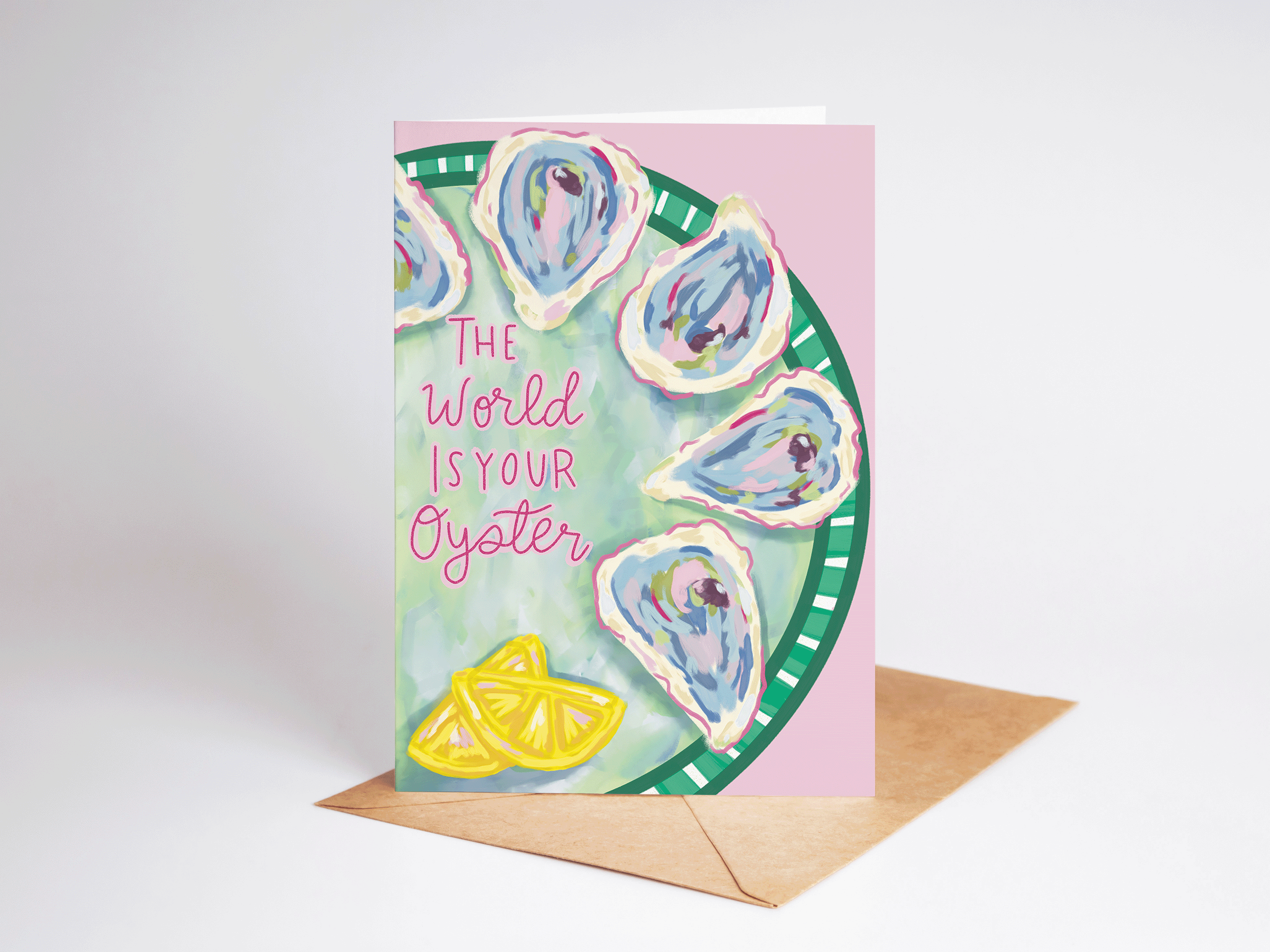 Remind them of all the world has to offer with this adorable 5x7 card, featuring a delicious and colorful plate of oysters on a light pink background and the phrase "The World Is Your Oyster". The card is blank inside for your own personal message, and comes with a brown kraft envelope. Perfect for so many occasions - graduations, retirements, promotions, new beginnings, beachy birthdays, just because, encouragement, congratulations, and more!